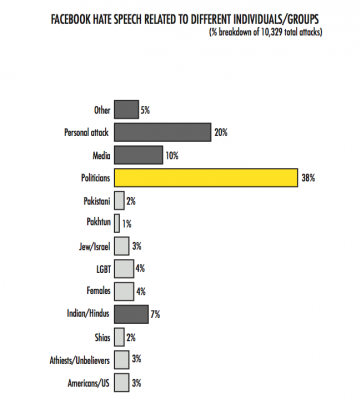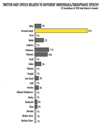 The majority of hate speech recorded on Twitter was personal attacks and abuse (41%). Other major targets included politicians (11%), Pakistanis (10%), media persons/groups (7%), and Indians/Hindus (6%). Total hate speech recorded on Twitter contained some attacks on Deobandis (2%), Shias (2%), Muslim clerics (1%) and general attacks on Muslims/Islam (1%).