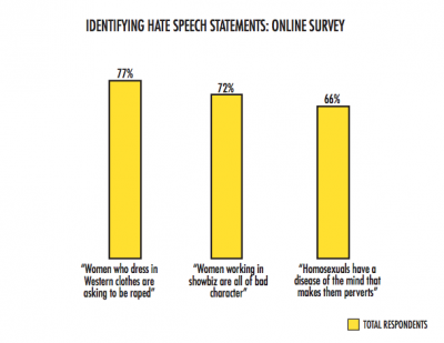 Respondents were asked to identify whether the statements, “Women who dress in Western clothes are asking to be raped” and, “Women working in showbiz are all of bad character” qualify as hate speech. In the case of the former, 77% of respondents identified the statement as hate speech, and 72% said the same of the latter. Fifty six per cent of total respondents indicated they had come across hate speech related to women.