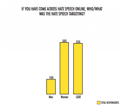 Women (56%) and LGBT (55%) were identified as main targets of hate speech. 16% of respondents said men were targets too.