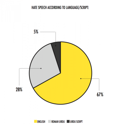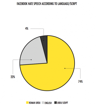 In terms of language, hate speech recorded on Facebook was largely in Roman Urdu (74%) followed by English (22%) and Urdu script (4%).