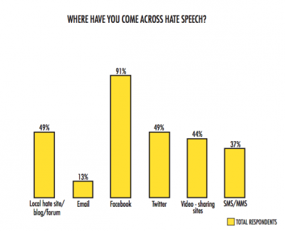 The vast majority of total respondents indicated they had come across hate speech on Facebook (91%). Facebook was the only network/medium where more than half of respondents indicated they had encountered this kind of speech.