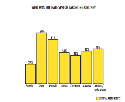 Among religious targets, total respondents indicated that hate speech against Shias (70%) and Ahmadis (61%) was markedly high.
