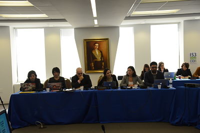 La audiencia, solicitada por estas organizaciones se realizó en Washington, durante el 153º período de sesiones. Estuvo presidida por la comisionada Rose-Marie Belle Antoine, y contó con la participación de los comisionados José de Jesús Orozco Henríquez y Paulo Vannuchi y del Relator especial para la libertad de expresión, Edison Lanza. Contó con el apoyo de veinte organizaciones a nivel continental que celebraron la existencia de la audiencia. Las presentaciones contaban con el antecedente de un anexo presentado junto con la solicitud de la audiencia.